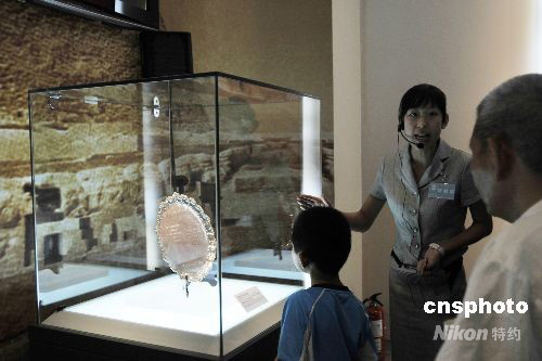 8月7日,北京奧運(yùn)重要文化項(xiàng)目《世界瑰寶——中華人民共和國(guó)國(guó)際禮品展》在中國(guó)人民革命軍事博物館開(kāi)幕。據(jù)悉,此次的國(guó)際禮品展堪稱中國(guó)國(guó)禮最全面的一次公開(kāi)亮相。圖為講解員為參觀者介紹1963年阿拉伯聯(lián)合共和國(guó)蘇伊士運(yùn)河管理局贈(zèng)中國(guó)國(guó)務(wù)院總理周恩來(lái)的“銀刻字花邊圓盤(pán)”。中新社發(fā) 王宇婷 攝
