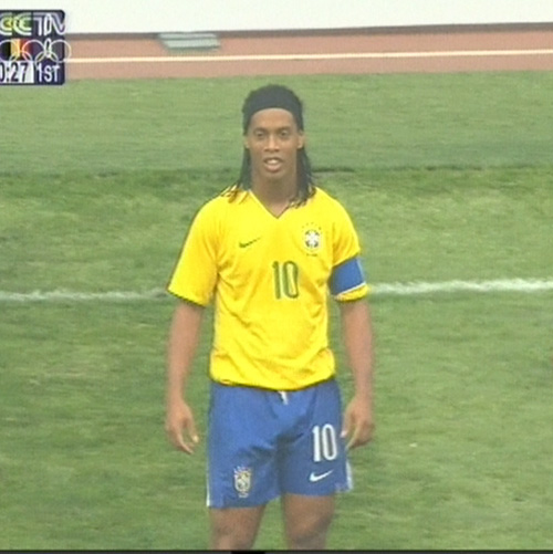 巴西隊(duì)小羅以隊(duì)長(zhǎng)身份亮相。(電視截圖)