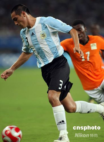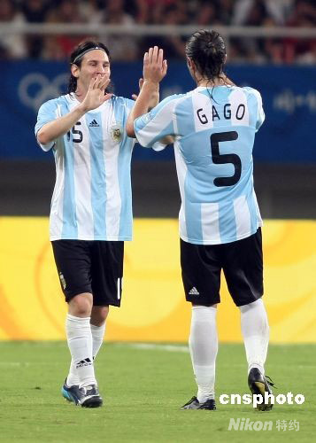 8月7日,北京奧運(yùn)會(huì)上海足球分賽場(chǎng)男足預(yù)賽,代表阿根廷出戰(zhàn)的梅西(MESSI Lionel)(左),在首場(chǎng)對(duì)陣科特迪瓦的比賽中,為阿根廷攻入本屆奧足賽首粒進(jìn)球。 中新社發(fā) 湯彥俊 攝