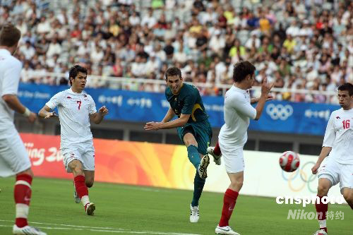 8月7日,北京奧運(yùn)會男子足球預(yù)賽A組,澳大利亞對塞爾維亞的比賽在上海體育場進(jìn)行。最終,澳大利亞1:1戰(zhàn)平塞爾維亞,雙方握手言和。圖為澳大利亞5號選手SPIRANOVIC Matthew在多位防守隊(duì)員包圍下起腳射門。中新社發(fā) 湯彥俊 攝