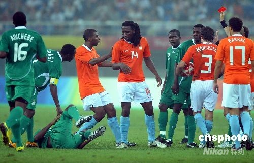 圖:奧運(yùn)男足荷蘭14號(hào)隊(duì)員被紅牌罰下場(chǎng) (3)