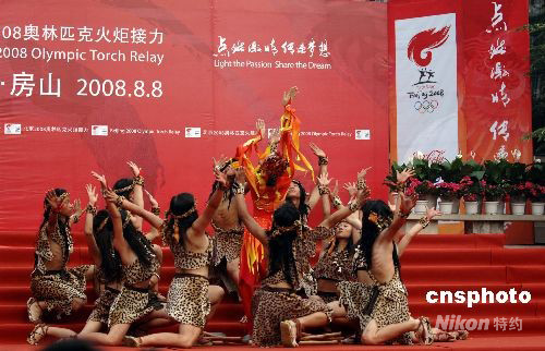 8月8日清晨,第29屆夏季奧運會火炬,從周口店遺址出發(fā),開啟最后一天的傳遞。圖為扮演遠古時代北京人的男女演員以“原生態(tài)”的舞蹈歡迎奧運火炬。中新社發(fā) 王東明 攝