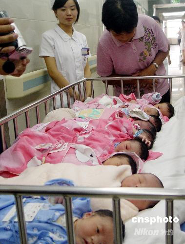 八月八日,河南鄭州一家醫(yī)院內(nèi)剛洗過(guò)澡的幾位“奧運(yùn)寶寶”。雖然專(zhuān)家一再?gòu)?qiáng)調(diào)擇日剖宮產(chǎn)不可取,但為生個(gè)“奧運(yùn)寶寶”,鄭州市還是有近二百名準(zhǔn)媽媽預(yù)約進(jìn)行剖宮產(chǎn)。中新社發(fā) 李志全 攝