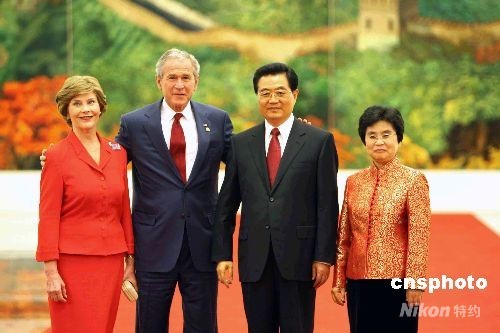8月8日中午,中國(guó)國(guó)家主席胡錦濤和夫人劉永清在北京人民大會(huì)堂為出席北京奧運(yùn)會(huì)的貴賓舉行歡迎宴會(huì)。圖為胡錦濤夫婦歡迎美國(guó)總統(tǒng)布什夫婦。中新社發(fā) 任海霞 攝