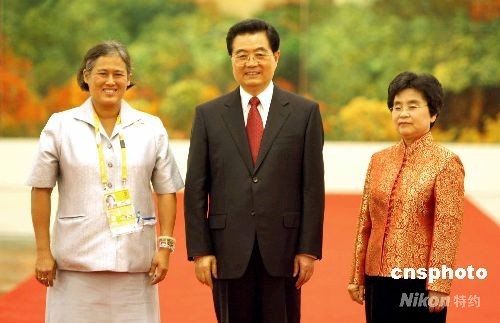 8月8日中午,中國國家主席胡錦濤和夫人劉永清在北京人民大會堂為出席北京奧運(yùn)會的貴賓舉行歡迎宴會。圖為胡錦濤夫婦歡迎泰國公主詩琳通。中新社發(fā) 任海霞 攝