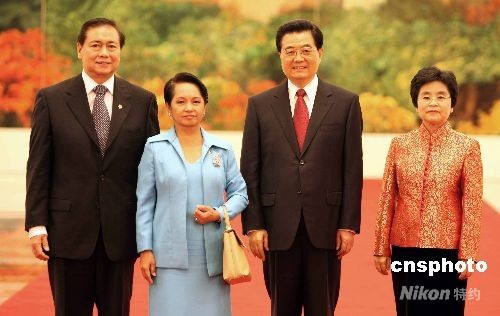 8月8日中午,中國(guó)國(guó)家主席胡錦濤和夫人劉永清在北京人民大會(huì)堂為出席北京奧運(yùn)會(huì)的貴賓舉行歡迎宴會(huì)。圖為胡錦濤夫婦歡迎菲律賓總統(tǒng)阿羅約夫婦。中新社發(fā) 任海霞 攝