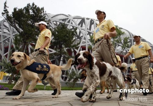 8月8日,第29屆夏季奧運(yùn)會(huì)將于當(dāng)晚在北京奧林匹克公園內(nèi)的國家體育場開幕,為保證開幕式的順利進(jìn)行,“鳥巢”周邊安保措施升級(jí)。圖為搜爆犬在“鳥巢”周邊搜爆。