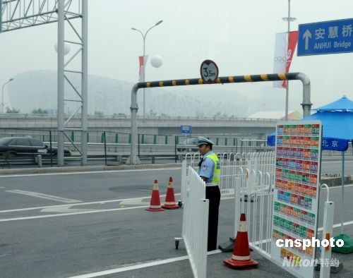 八月八日,北京“鳥巢”體育場(chǎng)外圍的警察在貼有各種車輛通行證的指示牌前,負(fù)責(zé)疏導(dǎo)參加北京奧運(yùn)會(huì)開幕式的交通。中新社發(fā) 賈國(guó)榮 攝