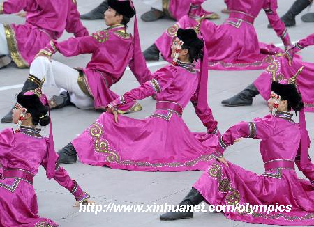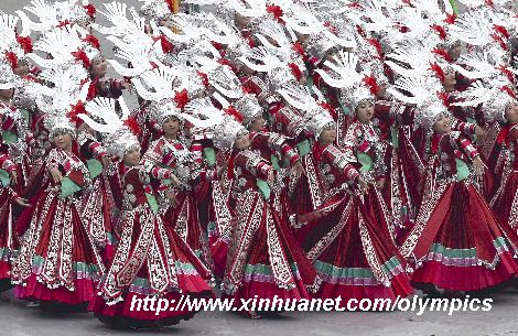 圖為8月8日,演員們在奧運會開幕式前進行表演,第29屆奧運會開幕式將在國家體育場——“鳥巢”舉行。