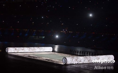 8月8日晚,第二十九屆奧林匹克運動會在北京開幕。由中國著名電影導演張藝謀指導的北京奧運會開幕式文藝演出節(jié)目中的核心部分——《美麗的奧林匹克》,全部內容圍繞一幅“中國古代畫卷”卷軸的開啟展開。中新社發(fā) 任晨鳴 攝