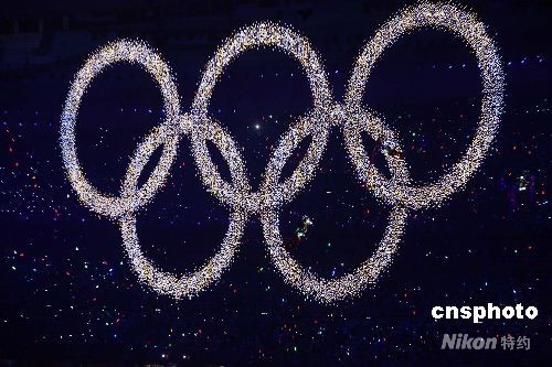 8月8日晚8時(shí)8分,第二十九屆夏季奧運(yùn)會(huì)在北京的國家體育場(chǎng)--鳥巢隆重開幕。五環(huán)圖案在北京“鳥巢”內(nèi)閃耀。中新社發(fā) 任晨鳴 攝