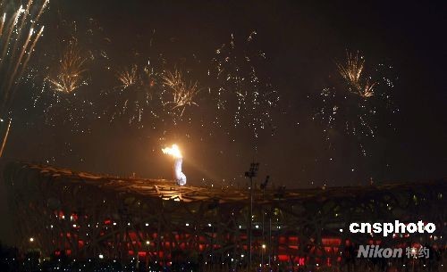 8月8日,第29屆夏季奧運會在北京奧林匹克公園內(nèi)的國家體育場“鳥巢”舉行。李寧點燃北京奧運會主火炬,奧運圣火在鳥巢上空熊熊燃燒。中新社發(fā) 盛佳鵬 攝