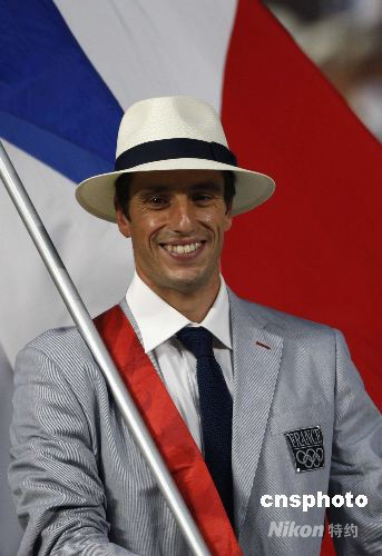 圖為法國奧運代表團的旗手、兩屆奧運皮劃艇激流回旋項目的金牌得主托尼·埃斯蓋當。中新社發(fā) 杜洋 攝