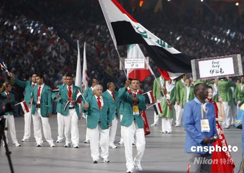 8月8日,第29屆夏季奧運(yùn)會(huì)在北京奧林匹克公園內(nèi)的國(guó)家體育場(chǎng)“鳥巢”開幕。圖為伊拉克代表團(tuán)入場(chǎng)。8月4日,伊拉克代表團(tuán)一行11人經(jīng)科威特后再由迪拜轉(zhuǎn)機(jī)搭乘阿聯(lián)酋航空公司航班順利抵達(dá)北京。
