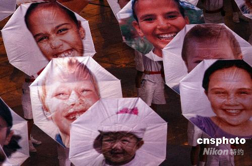 第二十九屆夏季奧運(yùn)會(huì)8月8日晚在北京奧林匹克公園內(nèi)的國(guó)家體育場(chǎng)舉行開(kāi)幕式,從世界各地征集的2008個(gè)兒童的笑臉向八方賓客歡笑。 中新社發(fā) 任晨鳴 攝