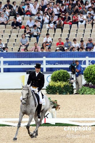 圖為首名登場的新西蘭選手圖·馬克(Todd Mark)在三項賽第一回合盛裝舞步賽中。中新社發(fā) 洪少葵 攝