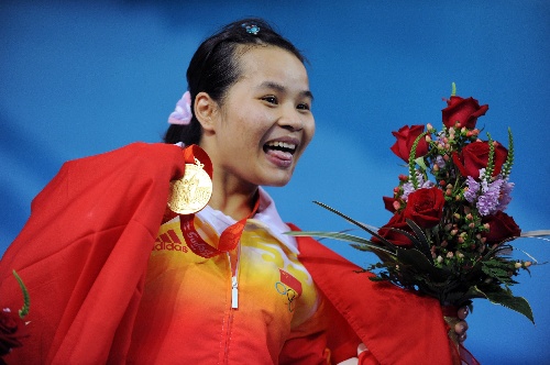 8月9日,中國(guó)選手陳?ài)葡荚陬C獎(jiǎng)儀式上向觀眾致意。當(dāng)日,中國(guó)選手陳?ài)葡荚诒本⿰W運(yùn)會(huì)女子48公斤級(jí)舉重比賽中以212公斤的總成績(jī)獲得冠軍,為中國(guó)代表團(tuán)捧得首金。 新華社記者楊磊攝