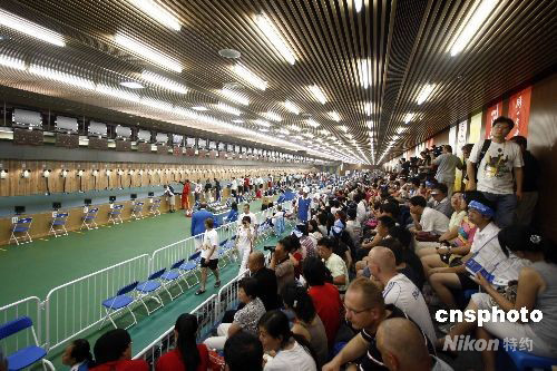 北京奧運(yùn)會射擊男子10米氣手槍資格賽在北京射擊館舉行,參賽的中國選手龐偉晉級決賽,老將譚宗亮發(fā)揮欠佳慘遭淘汰。圖為觀眾在賽場內(nèi)觀看比賽。中新社發(fā) 盛佳鵬 攝