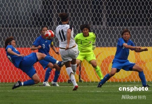 上半場(chǎng)美國(guó)隊(duì)11號(hào)卡莉·勞埃德首先攻克日本隊(duì)大門(mén)。