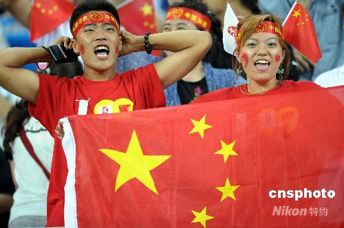 8月9日晚,中國女足在天津奧體中心水滴體育場與加拿大女足進(jìn)行奧運(yùn)第二場小組賽的較量,球迷在比賽現(xiàn)場為奧運(yùn)會女足比賽加油。 中新社發(fā) 陳文 攝
