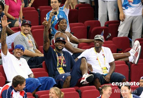 8月9日,美國總統(tǒng)布什一家來到五棵松體育館為美國女籃助威。同時前來為助威的美國男籃“夢八隊”的超級球星:詹姆斯、韋德、霍華德、安東尼等,向布什總統(tǒng)致敬。 中新社發(fā) 任晨鳴 攝
