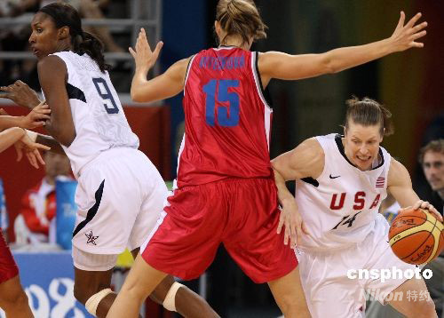 8月9日晚,雅典奧運(yùn)會(huì)冠軍美國女籃在北京奧運(yùn)會(huì)籃球館——五棵松體育館開始衛(wèi)冕之旅,首場比賽以97比57擊敗捷克隊(duì)。圖為美國隊(duì)超級(jí)球星9號(hào)萊斯麗,利用檔拆戰(zhàn)術(shù)協(xié)助14號(hào)后衛(wèi)史密斯突破捷克隊(duì)防線。 中新社發(fā) 任晨鳴 攝