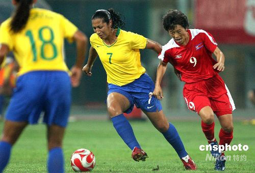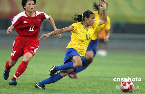 8月9日,北京奧運會沈陽分賽場舉行女足預賽,巴西隊最終以2:1勝朝鮮隊。巴西球星瑪塔打入第二粒進球。 中新社發(fā) 張宇 攝