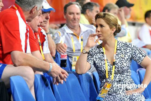 八月九日晚,北京奧運馬術(shù)項目在香港沙田賽場舉行盛裝舞步賽事,國際馬術(shù)聯(lián)合會主席、約旦公主哈雅到場觀賽,并與參賽隊伍職員在看臺上交談。中新社發(fā) 鄧慶樂 攝