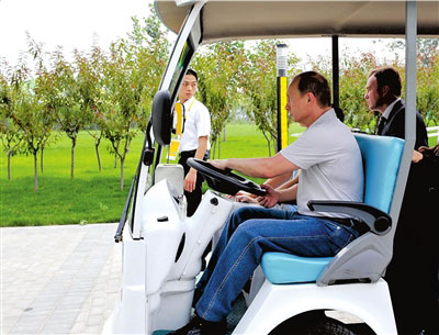 9日,普京駕電瓶車參觀北京奧運(yùn)村。