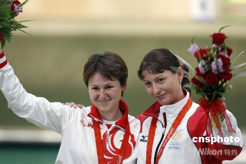 8月10日,北京奧運(yùn)會(huì)女子10米氣手槍決賽在北京射擊館落下帷幕,中國選手郭文珺以492.3環(huán)勇奪金牌,俄羅斯選手納塔利婭·帕杰林娜總分489.1環(huán)位列第二獲得銀牌,格魯吉亞老將妮諾·薩盧克瓦澤以487.4環(huán)的成績奪得銅牌。 圖為帕杰林娜(左)與薩盧克瓦澤在領(lǐng)獎(jiǎng)臺(tái)上親密合影。 中新社發(fā) 盛佳鵬 攝