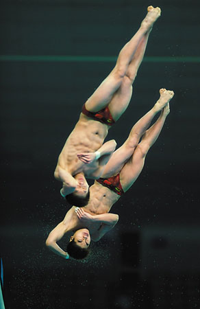 在2007年贏得世錦賽冠軍時(shí),林躍/火亮組合的4個(gè)自選動(dòng)作難度系數(shù)總和為13.3,當(dāng)時(shí)總分為489.48分。其中,裁判在比賽過(guò)程中共出示了18個(gè)10分滿分,可見兩人實(shí)力之強(qiáng)大。在今年2月“好運(yùn)北京”第16屆跳水世界杯賽上,兩人再次折桂。不同的是,這次他們將原本壓軸的307C調(diào)整到倒數(shù)第二跳,將壓軸跳留給了難度系數(shù)高達(dá)3.8的5255B。這樣一來(lái),難度只有3.3的207C被取代,兩人的難度系數(shù)總和也上升到13.8,在世界跳壇尚難有其他組合能夠比肩。