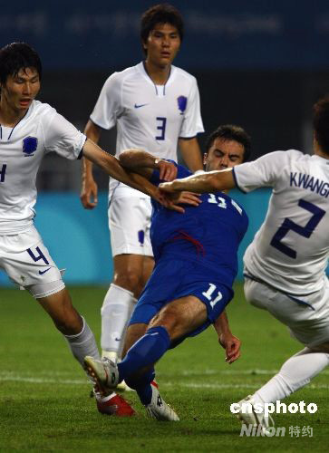 8月10日,北京奧運男足預(yù)賽,意大利對韓國的比賽在秦皇島奧體中心舉行,上半場意大利2:0領(lǐng)先韓國隊。圖為意大利隊11號朱塞佩·羅西首先攻破韓國大門。 中新社發(fā) 劉新 攝
