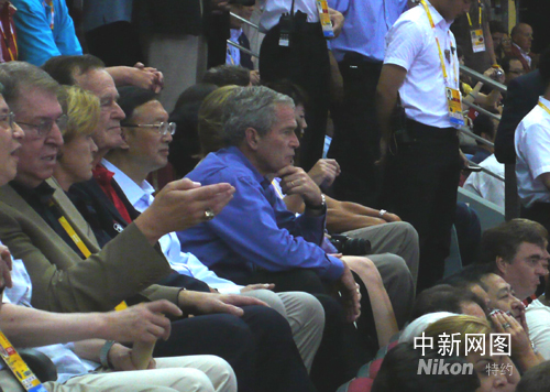 8月10日晚,北京奧運(yùn)會(huì)男子籃球中國(guó)隊(duì)與美國(guó)“夢(mèng)八隊(duì)”之戰(zhàn)在五棵松籃球館舉行,美國(guó)總統(tǒng)布什夫婦、老布什夫婦在中國(guó)外長(zhǎng)楊潔篪陪同下與爆滿的觀眾共同觀看比賽。 中新社發(fā) 任晨鳴 攝