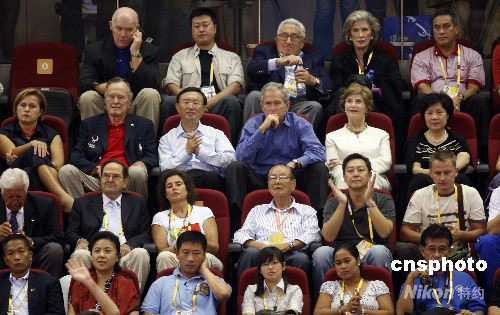 8月10日晚,北京奧運會男子籃球中國隊與美國“夢八隊”之戰(zhàn)在五棵松籃球館舉行,美國總統布什夫婦、老布什夫婦在中國外長楊潔篪陪同下與爆滿的觀眾共同觀看比賽。 中新社發(fā) 盛佳鵬 攝