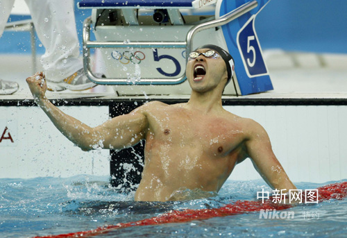 8月11日,在北京奧運會游泳男子100米蛙泳比賽中,日本選手北島康介以58.91秒成績打破世界紀(jì)錄奪得該項目冠軍。中新社發(fā) 杜洋 攝
