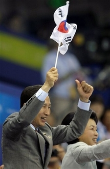據(jù)韓國《朝鮮日報》等媒體報道,9日下午在北京奧林匹克中心舉行的韓國女子手球隊同俄羅斯隊的比賽中,李明博上半場進行到中間的時候入場,揮舞韓國國旗為韓國隊加油。但是,李明博揮舞的韓國國旗的太極圖案和四卦上下顛倒。在總統(tǒng)身旁一起加油助威的金潤玉女士和文化體育觀光部長官柳仁村等人的旗幟則正常。