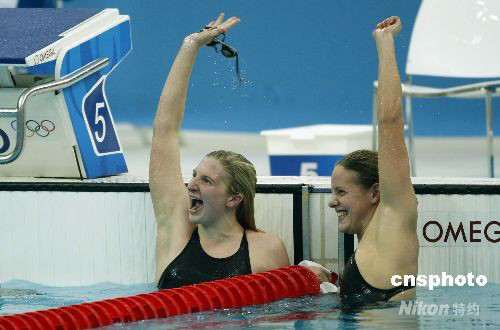 8月11日,北京奧運會女子400米自由泳,英國選手麗貝卡 ·阿德林頓以4分3秒22的成績獲得冠軍(左),隊友喬安妮·杰克遜(右)以4分3秒52獲得銅牌。中新社發(fā) 杜洋 攝