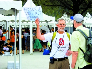 記者上午8點(diǎn)30分左右從地鐵10號(hào)線北土城站出站,準(zhǔn)備換乘8號(hào)線去比賽場(chǎng)館,剛走出地面,就看到身穿各式服裝的老外手持中英文標(biāo)牌執(zhí)著地站在那里求票。“我想要一張游泳的門(mén)票”、“想要一張?bào)w操比賽的門(mén)票”、“任何奧運(yùn)比賽場(chǎng)館門(mén)票都行”。記者看到老外們的“求票牌”有的用中英文打印出來(lái),有的是用歪歪扭扭的中文寫(xiě)的,反正無(wú)一例外都在“求票”。