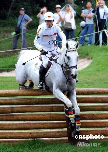 八月十一日,北京奧運馬術(shù)三項賽個人賽之越野賽在香港上水雙魚河舉行,結(jié)果德國選手欣里!け说谩ち_邁克在盛裝舞步賽及越野賽后暫時在績分上領(lǐng)先。圖為他與坐騎“馬里烏斯·福格特”在越野賽上成功飛躍跨欄。 中新社發(fā) 鄧慶樂 攝