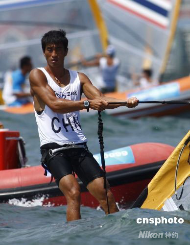 8月11日下午,奧帆賽尼爾級(jí)帆板開賽,在剛剛結(jié)束的男子帆板第二輪比賽中。中國(guó)選手王愛忱小組排名第八,前兩輪比賽總排名第三,凈得分10。 中新社發(fā) 周青先 攝