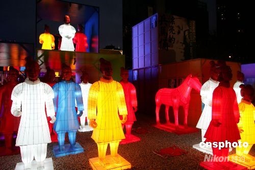 北京CBD內(nèi)充滿時尚感的世貿(mào)天階奧運(yùn)文化廣場上,102尊兵馬俑彩燈擺出氣勢恢弘的陣形。不是遠(yuǎn)自秦朝的陶土塑就,它們周身光彩奪目;不是身披鎧甲充滿殺氣,它們攜老扶幼,盡顯家庭歡樂。一個個燈彩透著歷史的深邃,也投身于眼前的奧運(yùn)狂歡。從即日起至8月24日,他們將以特殊的方式為人們講述中華文化的源遠(yuǎn)流長。中新社發(fā) 富田 攝