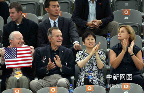 8月12日上午,北京奧運會男子體操團體決賽在國家體育館舉行,中國男隊以預賽第一的成績開始向金牌沖擊。美國前總統(tǒng)布什夫婦在美國駐華大使雷德陪同下前來觀看。中新社記者 任晨鳴 攝
