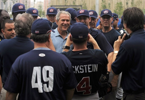 布什與美國棒球隊(duì)運(yùn)動(dòng)員交談并合影留念。