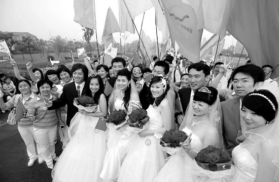 “真是沾了奧運(yùn)的光了,從8月8日到10日,每天五六對新人舉辦婚宴,工作人員都忙不過來了。由于場地限制,部分婚禮都安排在了晚上,平均每天晚上都有兩份婚禮!庇浾邌柤敖诨檠缜闆r時,沈陽最大的酒樓——天下春大酒店經(jīng)理李先生說。