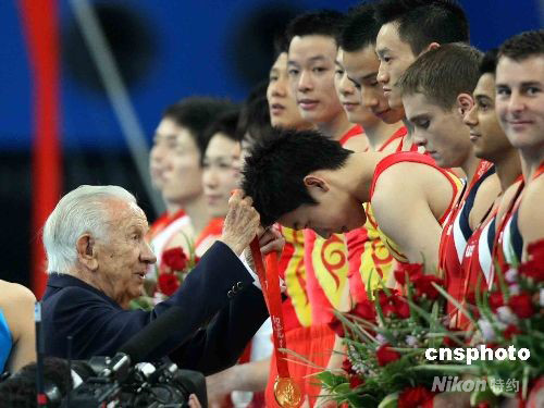 國際奧委會(huì)終生名譽(yù)主席薩馬蘭奇親自為中國隊(duì)頒獎(jiǎng)。中新社發(fā) 任晨鳴 攝
