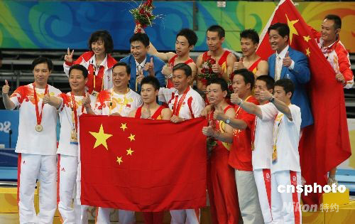 8月12日,北京奧運(yùn)會(huì)體操男子團(tuán)體決賽在國家體育館展開,中國男子體操隊(duì)繼悉尼奧運(yùn)之后再次登頂,以286.125 分獲得金牌,這也是本屆奧運(yùn)會(huì)體操賽場(chǎng)誕生的第一塊金牌、中國奧運(yùn)軍團(tuán)的第10塊金牌。 中新社發(fā) 武仲林 攝