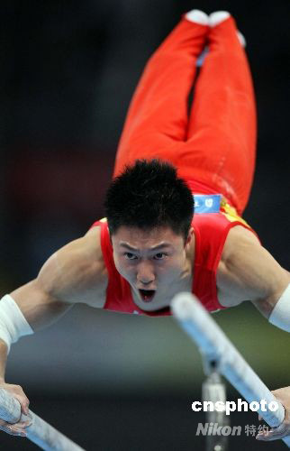 8月12日,北京奧運會體操男子團(tuán)體決賽在國家體育館展開,中國男子體操隊繼悉尼奧運之后再次登頂,以286.125 分獲得金牌,有中國“雙杠王”之稱的李小鵬在雙杠比賽中獲高分。中國體操名將李小鵬也超越李寧,成為獲得世界冠軍最多的中國體操選手。李寧的世界大賽金牌為14枚,李小鵬達(dá)到15枚。 中新社發(fā) 任晨鳴 攝
