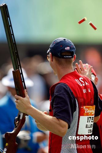 8月12日,北京奧運會男子飛碟雙多向決賽在北京射擊館進行,美國選手格倫·埃勒以190中獲得金牌。 中新社發(fā) 盛佳鵬 攝