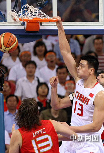 8月12日,北京奧運(yùn)會男子籃球小組賽第二輪賽事開賽,首戰(zhàn)負(fù)于“夢八隊”的中國男籃在姚明率領(lǐng)下向世錦賽冠軍西班牙隊發(fā)起猛攻。圖為姚明大力扣籃。中新社記者 任晨鳴 攝