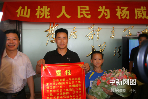 楊威率領(lǐng)中國體操男隊(duì)今日奪得奧運(yùn)會團(tuán)體金牌。十二日中午時(shí)分,當(dāng)消息傳到楊威的家鄉(xiāng)中國體操之鄉(xiāng)湖北仙桃市,早早守候在電視機(jī)前的當(dāng)?shù)孛癖娨黄序v,人們敲鑼打鼓,鞭炮齊鳴,熱烈慶賀仙桃籍運(yùn)動員楊威再次獲得奧運(yùn)會體操男團(tuán)冠軍。